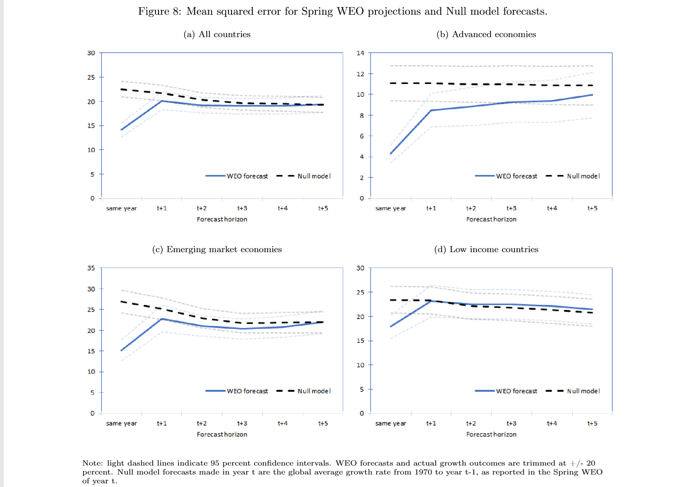 The figure below shows the MSE for WEO forecasts and forecasts generated by the Null model. In panel (a), one can see that while WEO forecasts (blue line) are substantially better (lower forecast error) than the Null model (black dash line) in the short run, these differences in performance become insignificant as the horizon widens.