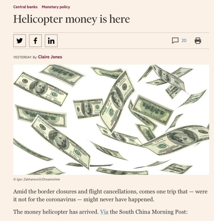 “The money helicopter has arrived,” Claire Jones writes in her FT Alphaville post, citing Hong Kong Finance Secretary’s announcement of a handout of HKD 10,000 to each permanent resident in the city.