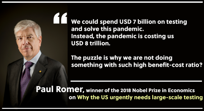 The US economy, however, started reopening this month without implementing sufficiently large-scale testing. Romer, disappointed, asked, “why we are not doing something that has such a high benefit-cost ratio?”