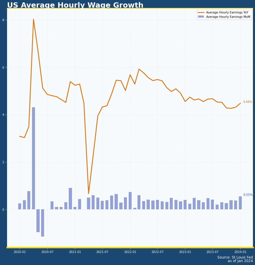 Nonfarm payroll increased 353K (previous: 333K ; 3-month average:227K) Unemployment rate was 3.7% (previous: 3.7%) Labor force participation rate was 62.5% (previous 62.5%); prime-age participation rate was 83.3% (previous: 83.2%) Average hourly wage growth was 4.48% YoY (previous 4.31%) ; MoM: 0.55% (previous: 0.4%) Annualized three-month hourly wage growth: 5.38% (previous:4.18%)