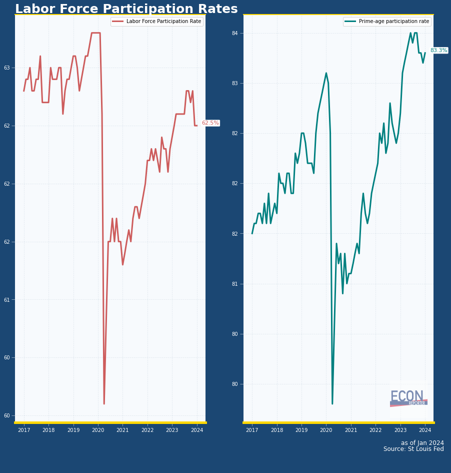 Meanwhile, labor participation rate held at 62.5% while the prime-age participation rate rose back to 83.3%, up 1 basis point from December.