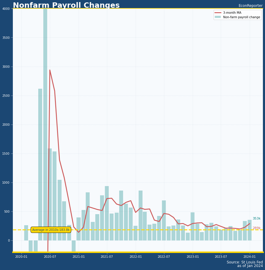 Nonfarm payroll increased by 353,000 in January, up from 333,000 in December, which was revised upward from 216,000. The 3-month average growth now sits at 227,000.
