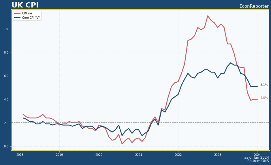 UK CPI rose 4% YoY in January, the same rate as in December; over the month, CPI dropped 0.5% from December. The monthly growth rate was 0.4% in December.