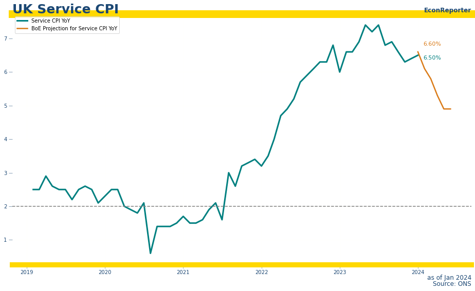 Bank of England in its last Monetary Policy Report projected service CPI to increase by 6.6% in January, so even though service inflation rebounded to 6.5%, largely a result of base effect, it still beat the central bank’s forecast.