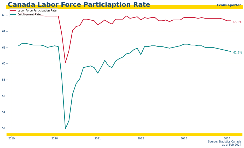 As a result, the labor participation rate, the share of population who are employed or looking for jobs, held at 65.3%, the employment rate lowered to 61.5%.