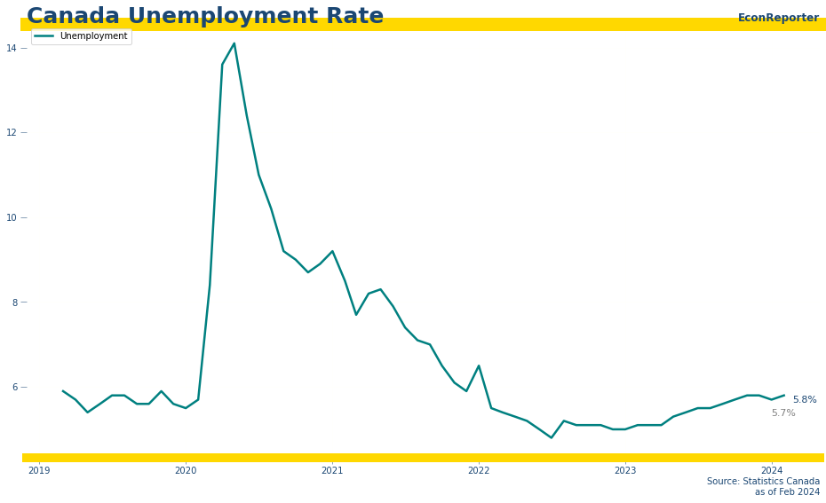 Statistic Canada on Friday reported that Canada’s unemployment rate rose to 5.8%, a step higher than 5.7% in January, reaching the highest level since the start of 2022.