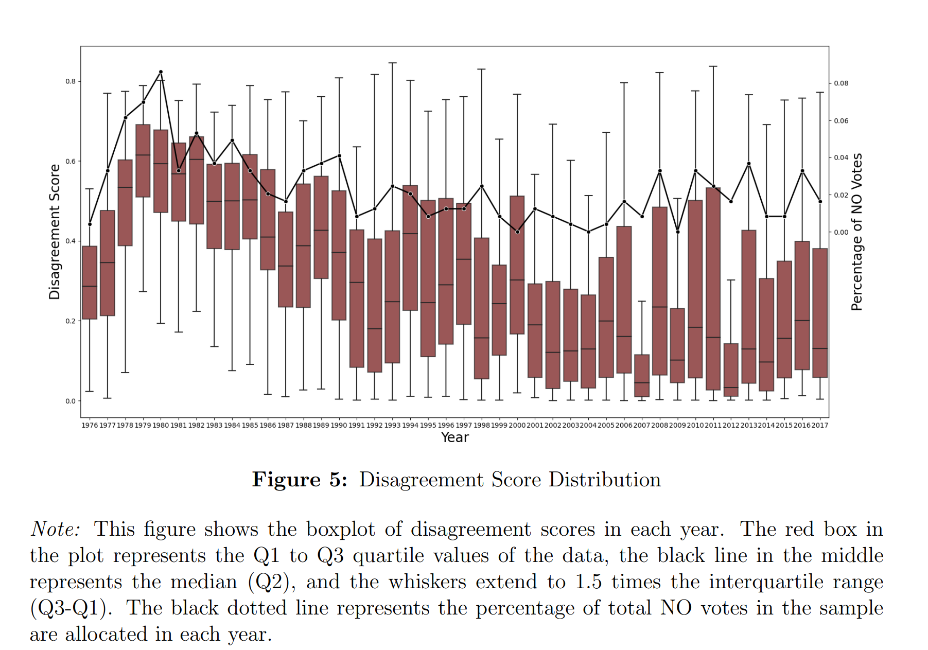 - The disagreement scores were relatively higher before the 1990s, with the yearly average even topped 0.5 in the late 70s and early 80s.