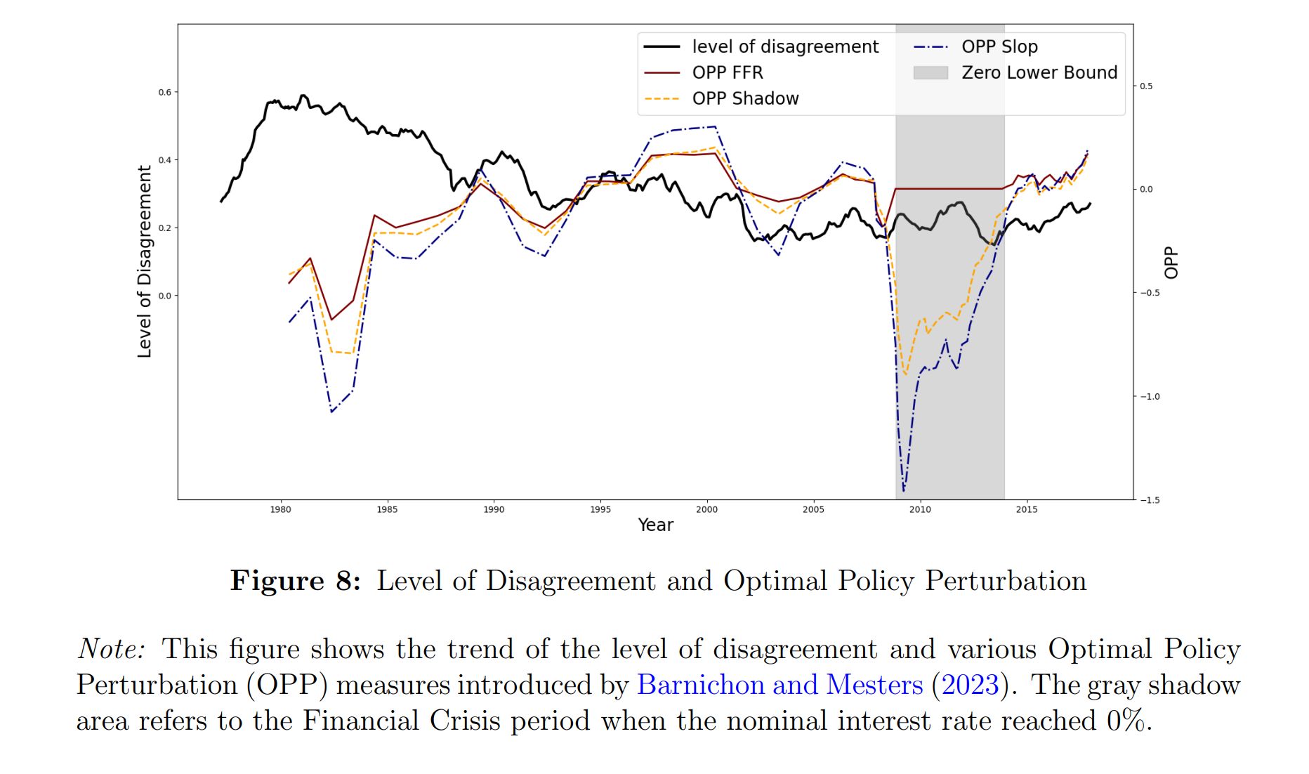 - Using the so-called optimal policy perturbation method to measure the Fed’s deviation from optimal policy path, the researchers show that the overly tight monetary policy (represented by a negative OPP reading) in the 70s and 80s may potentially explains why official secretly disagree with the chair.