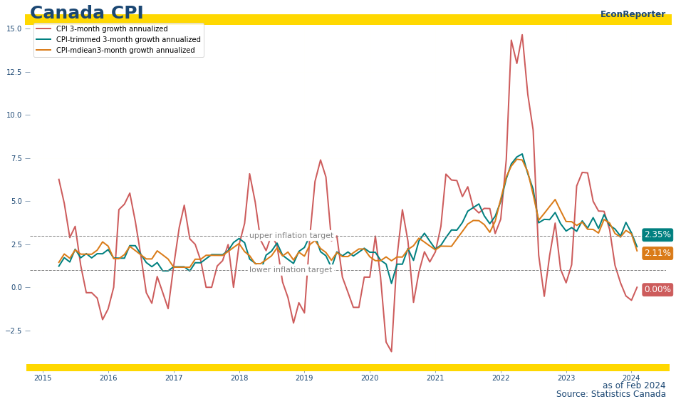 The two core inflation Bank of Canada adopted declined further, edging closer to the 3% upper limit of the central bank’s inflation target range, which centers around 2%