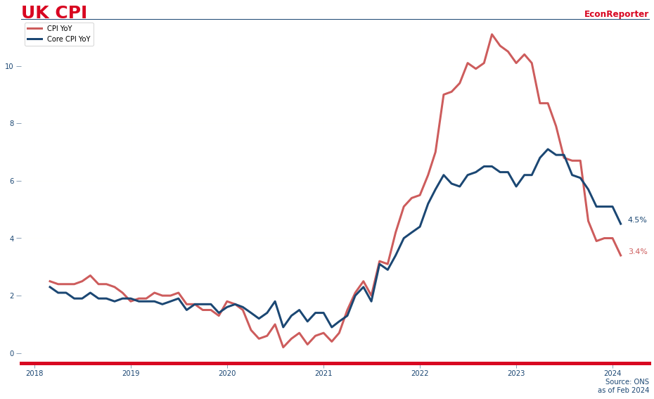 UK inflation rate cooled to 3.4% in February while core inflation also slowed to 4.5%, compared to a year earlier. Both figures are lower than market expectations.