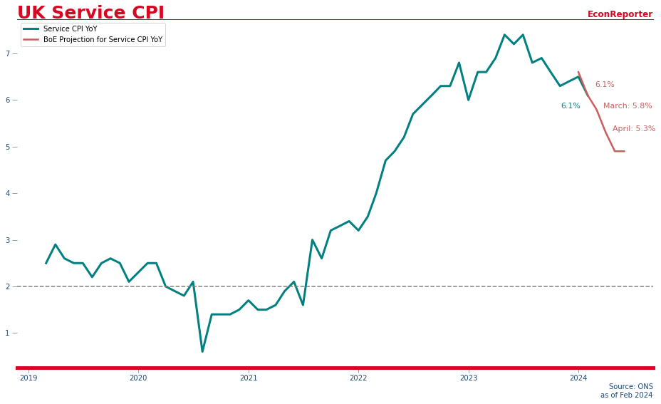 Service inflation, one of the major focuses of Bank of England, continued its decline to 6.1% in February,