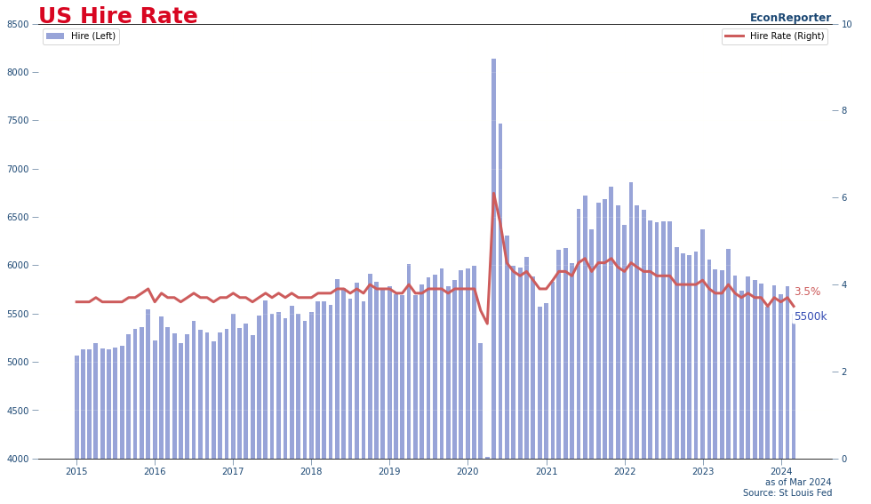 - hire rate, the number of hires divided by the total number of employed population, as a result also reduced to 3.5% from 3.7%