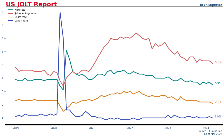 - both layoff rate and quit rate dropped 0.1 percentage point, to 1% and 2.1% respectively.