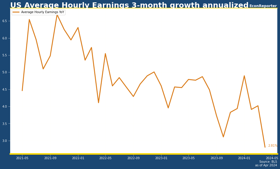• Annualized three-month hourly earnings growth: 2.81% (March:4.02%)