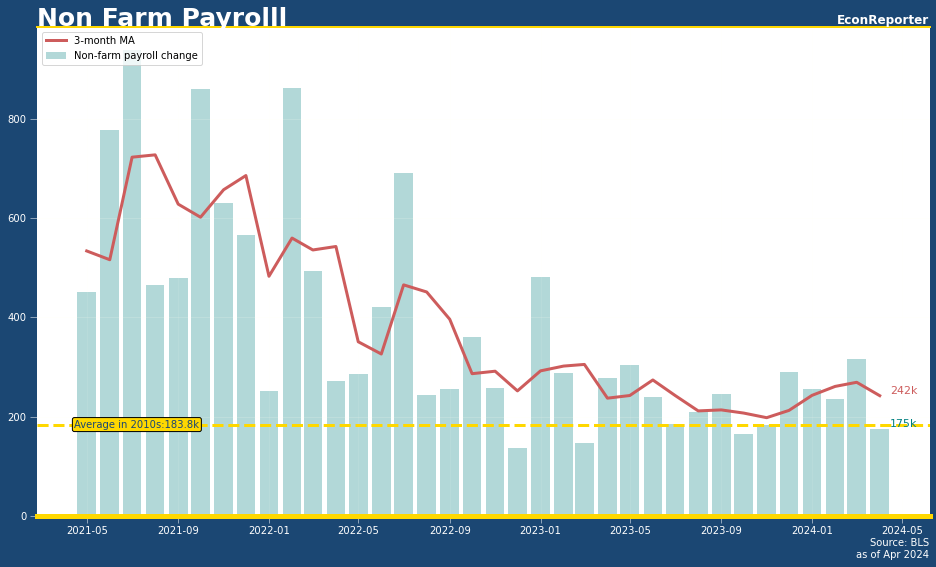 Nonfarm payroll increased 175,000 in April, a significant reduction from 315,000 in March and fell short of the market expectation of 243,000.