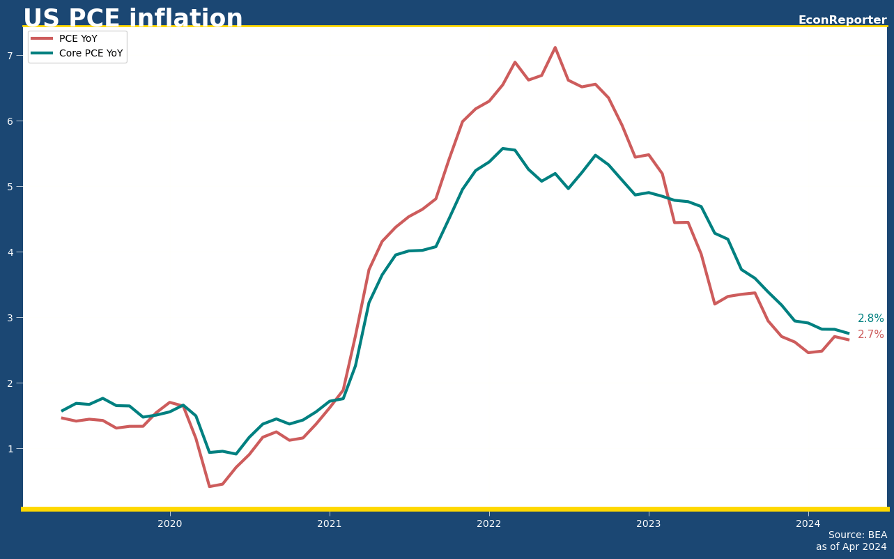 US PCE inflation held at a 2.7% yearly increase in April while core inflation, which strips out food and energy prices, maintained its pace at 2.8% for the third months, according to the Bureau of Economic Analysis’s latest report.