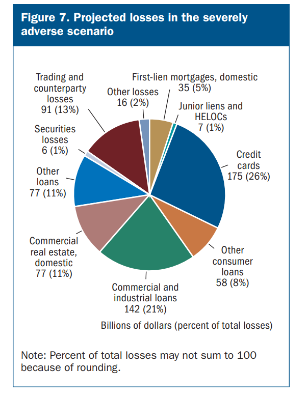 The banks are would to lose an aggregated USD 175 billion on their credit cards business, representing 26% of total projected losses. Commercial and industrial (C&I) loans, of which the non-investment grade loans’ share increased by 2 percentage points over the past year, would contribute to USD 142 billion of projected losses. Losses related to commercial real estate is estimated to be USD 77 billion.