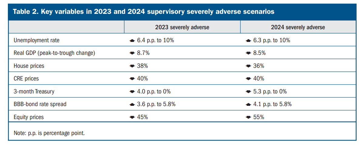 The stress test scenarios assume a severe global recession with sharp rise in unemployment to 10%, substantial fall in equity markets, as well as a period of heightened stress in commercial and residential real estate markets.