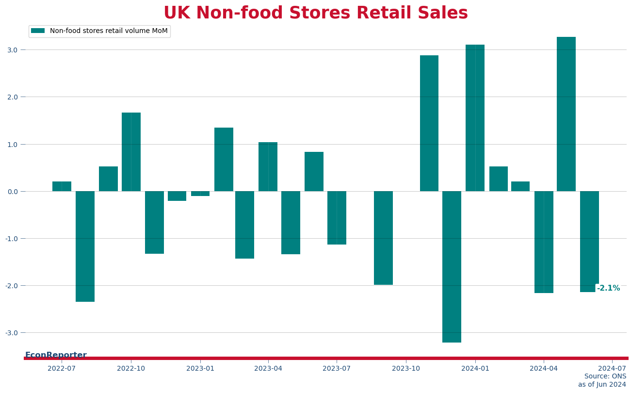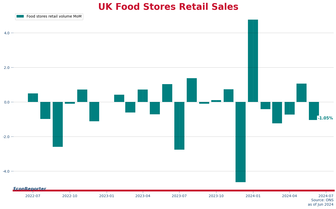 Monthly growth rate of UK retail sales volume fell 1.2% in June, after a 2.9% increase in the previous month. The data series has been quite volatile since November with significant increases usually followed by a substantial decline in the following month.