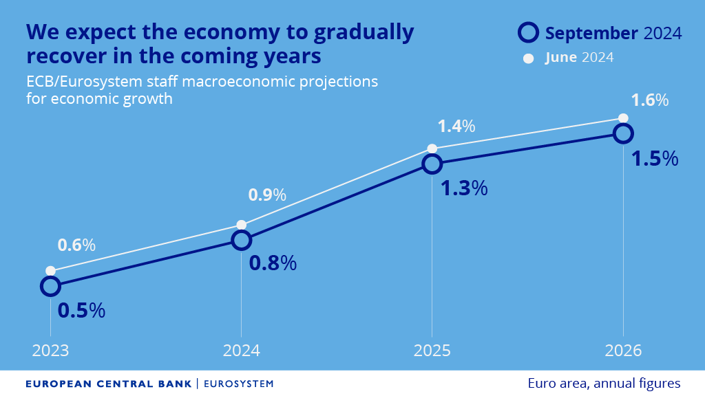 The GDP growth rates projected by ECB staff are now 0.8% in 2024, 1.3% in 2025 and 1.5% in 2026, with all three down 0.1 percentage point from the June forecast. Staff projection for core inflation in the eurozone are now 2.9% this year and 2.3% in 2025, both 0.1 percentage points higher than its previous estimates, as well as 2% in 2026 which was held unchanged.