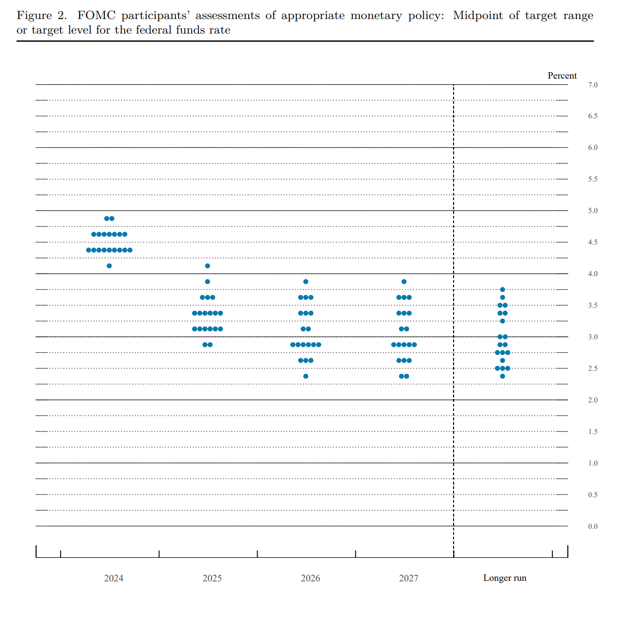 For example, look at the first ever dot plot above. Seven participants picked 4% as their preferred neutral rate and six chose 4.5%. This is the normal pattern in a dot plot, the longer-run rate projections usually cluster at certain levels. It has always been the case that at least one neutral nominal rate level was picked by no less than five Fed officials.