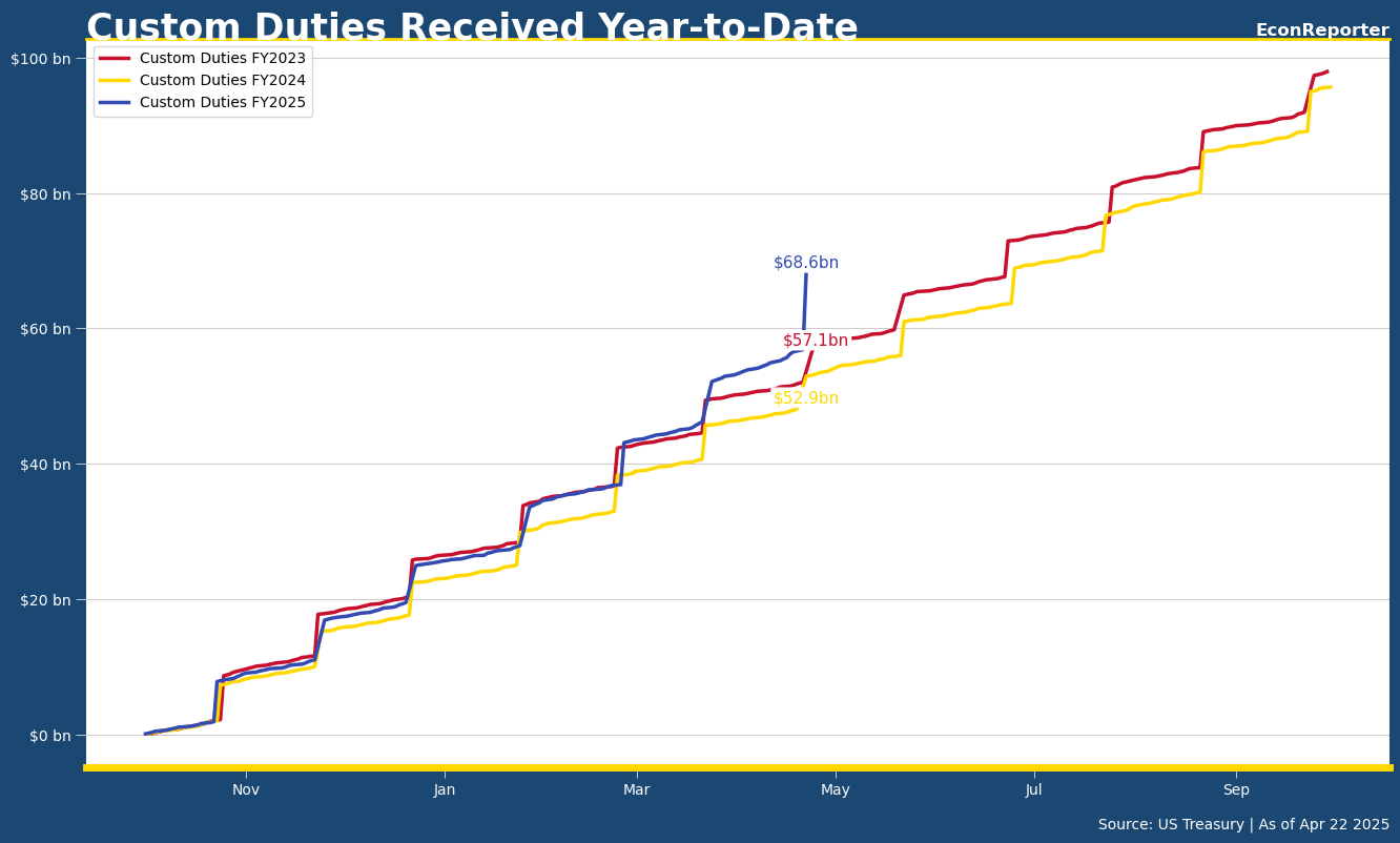 - As shown in US Treasury’s April 22 Daily Treasury Statement, the US government received USD 11.7 billion in a single day from customer duties. That brings the accumulated custom duties for the month to USD 15.4 billion and USD 68.6 billion year-to-date.