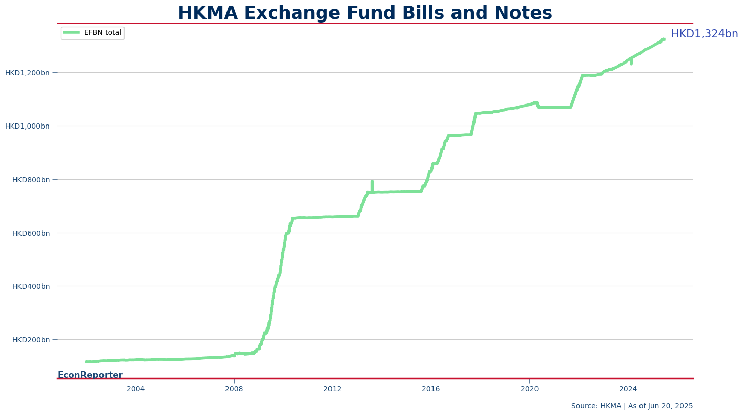 Since the Fed engaged in QE, the HKMA has issued a large volume of EFBNs. The total amount of EFBNs outstanding was less than HKD 200 billion at the start of 2008; today, there are over HKD 1.3 trillion of EFBNs in the Hong Kong financial system.