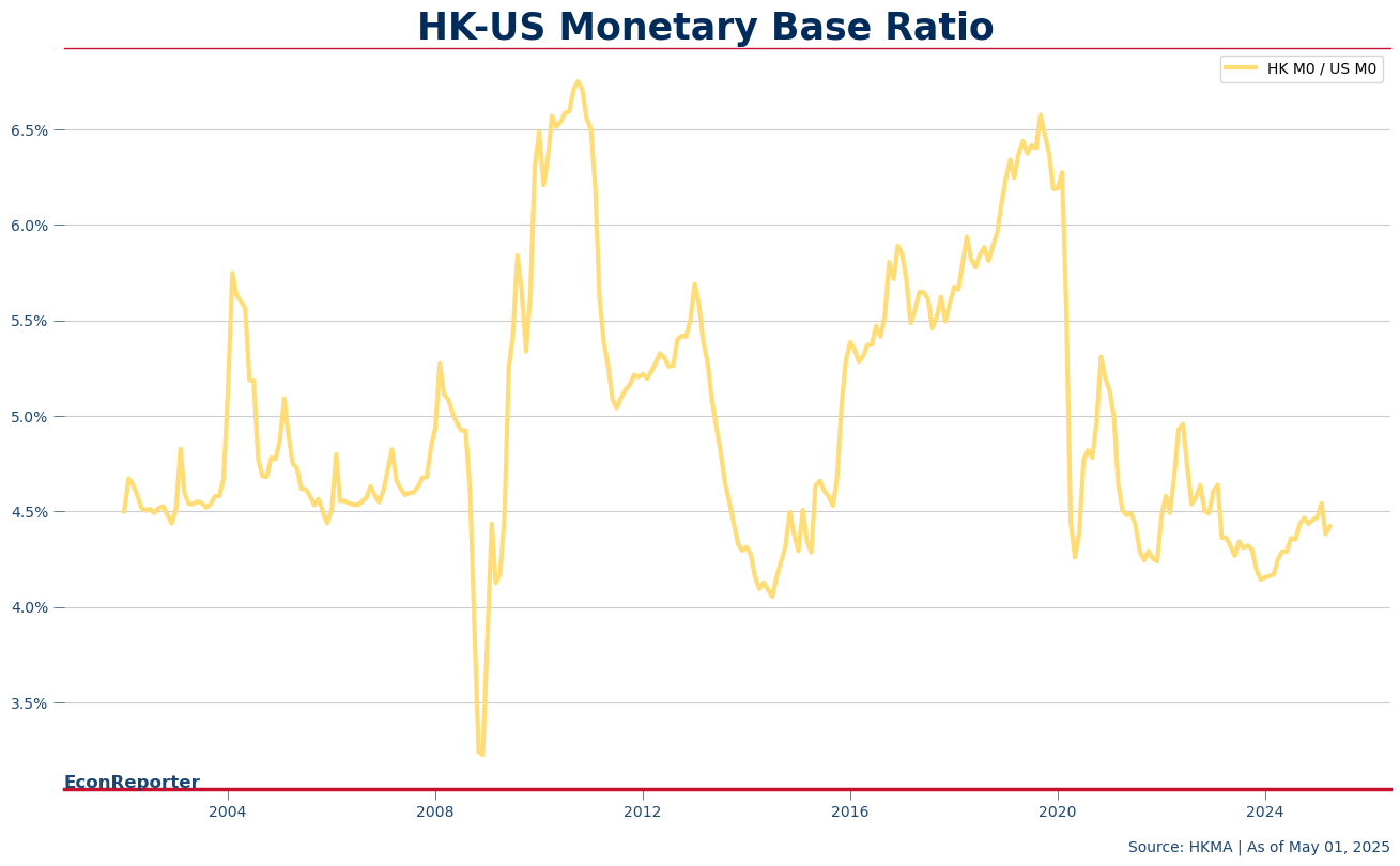 If we divide HKD M0 by USD M0, we can see a fluctuating yet, on average, relatively stable ratio of around 5%. In general, the monetary base for the HKD grew in proportion to that of the USD, even with the radical change in the US monetary policy regime.