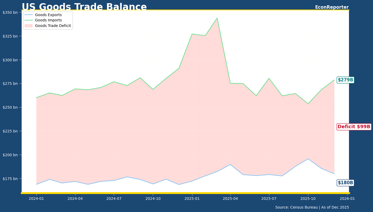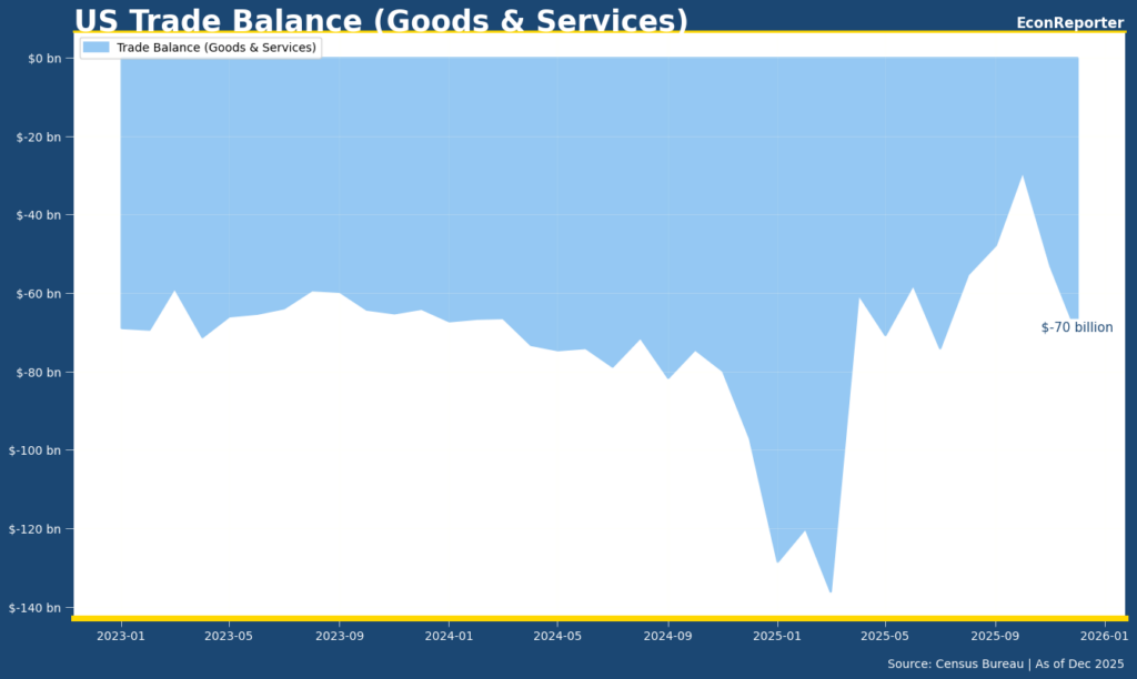US trade deficit continued to widen in December after hitting the smallest monthly amount since 2009 low in October. The total import was USD 70.3 billion higher than export in the last month of 2025, according to the US Census Bureau.