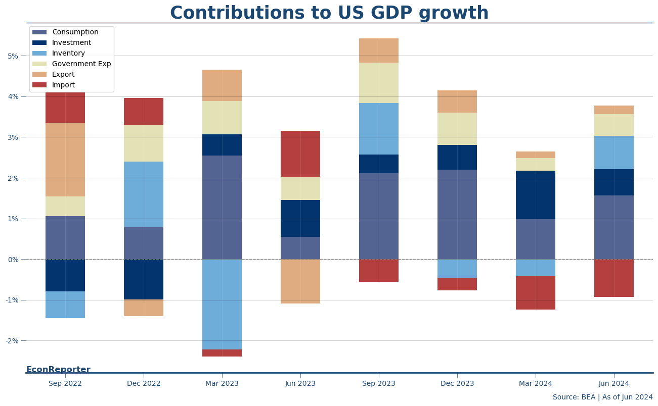 US GDP grew at a 2.8% annualized rate in Q2, significantly above than the 2% forecasted by market consensus. The resilient growth was supported by acceleration in consumer spending, increase in nonresidential fixed investment as well as an upturn in private inventory investment, according to the Bureau of Economic Analysis.