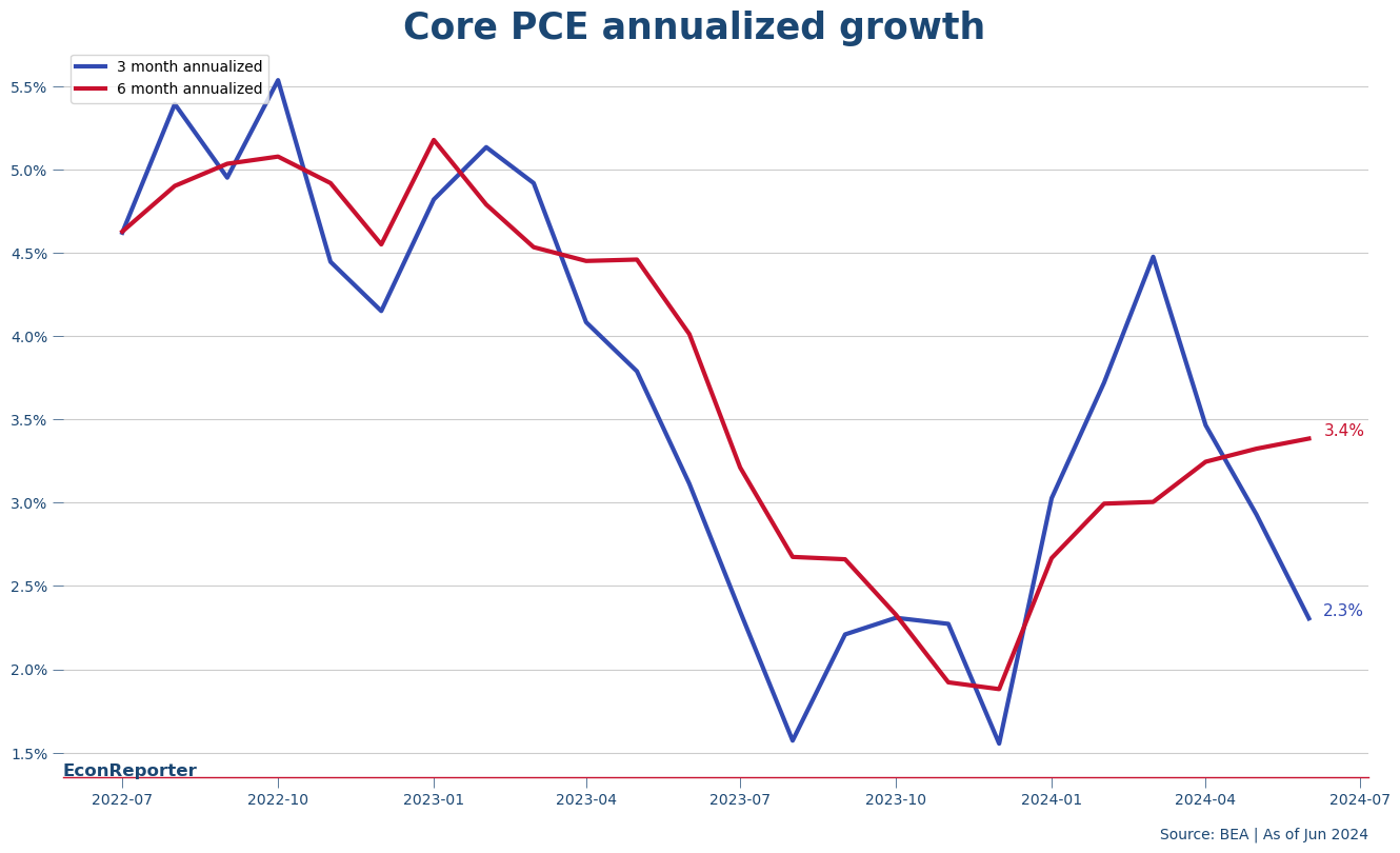 Core PCE inflation, Federal Reserve’s preferred inflation gauge, showed encouraging signs of disinflation through out Q2. Annualized three-month core PCE inflation fell to 2.3% for Q2, down from 4.48% at at the end of March, though not as low as 1.55% achieved at the end of Q4 last year.