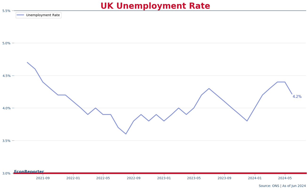 Unemployment rate in the UK decreased to 4.2% at the three months to June, against a market expectation of rising from the May reading of 4.4% to 4.5%, the Office for National Statistics (ONS) reported Tuesday.