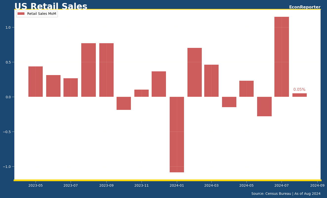 Retail sales in the US increased just 0.05% on a monthly basis in August, down from the outsized 1.15% growth in July but still beats market expectation of -0.2%, according to the Census Bureau’s latest release.